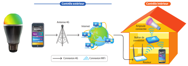 Aujourd'hui, des systèmes d'éclairage connectés sont équipés d'une interface de connexion Wifi qui permet de commander les ampoules connectées à partir d'un srnartphone ou d'un bouton-poussoir.