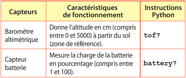 La programmation du drone s'appuie sur l'utilisation de structures algorithmiques (variables, instructions conditionnelles, boucles, fonctions) et d'un langage de programmation à partir duquel on sélectionne les Instructions[1] spécifiques aux capteurs et actionneurs.