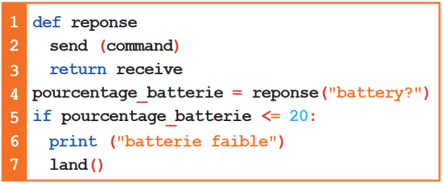 les lignes 1, let 3 : définissent la fonction « reprise ()» qui envoie une instruction au drone et attend sa reprise,