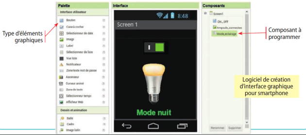 Pour réaliser l'allumage automatique d'une lampe connectée en fonction de la luminosité à partir de l'écran d'un smartphone, on utilise un logiciel qui permet de dessiner chaque élément graphique de l'interface.
