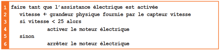 L'assistance électrique d'un vélo doit être constamment modulée. On peut décrire ce comportement sous la forme d'un algorithme[1] de contrôle.